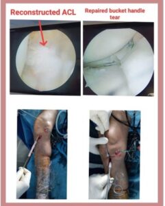Diagnostic Arthroscopy -it’s a first step of ACL surgery. This means I look inside the joint with a scope using small punctures and very small delicate instrumentation. I look carefully at the injured ACL & determine where and how it is torn. It can be partially or completely torn. An Other associated injuries like meniscus tear & cartilage damage can be deal this time.