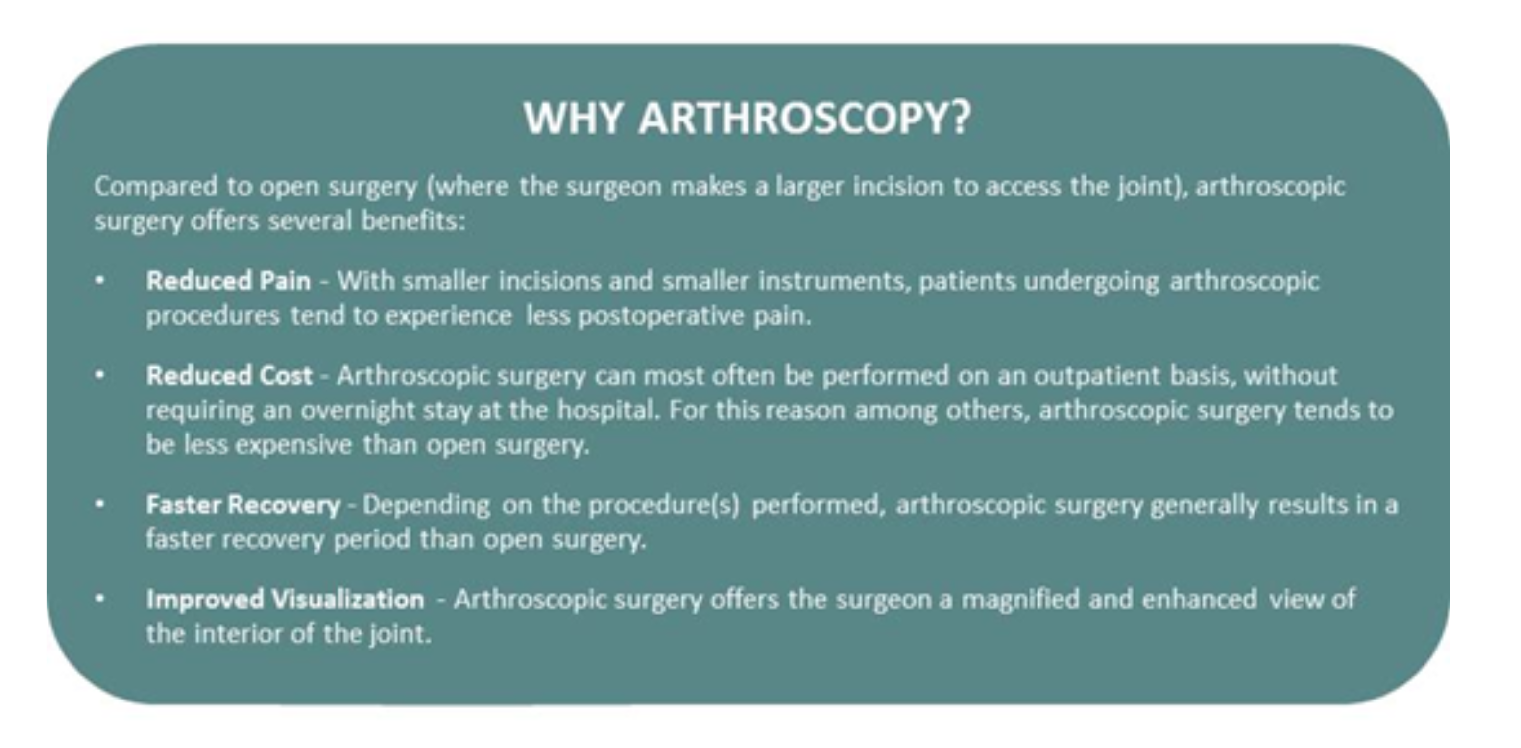The word arthroscopy comes from two Greek words, “arthro” (joint) and “skopein” (to look). The term literally means “to look within the joint.”